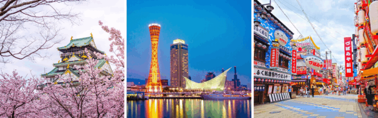 • Thành Osaka: Tham quan bên ngoài lâu đài cổ nổi tiếng với các chi tiết mạ vàng và ngói xanh ngọc.