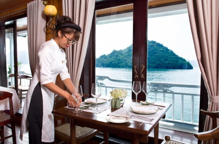 13:00: Dùng bữa trưa sang trọng trong khi tàu di chuyển qua hàng ngàn đảo đá vôi hùng vĩ.