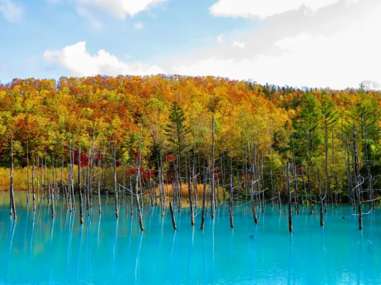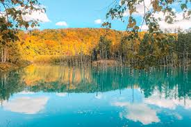 Shirogane Blue Pond Hồ nước nổi tiếng với sắc xanh huyền ảo, thay đổi theo ánh sáng và mùa trong năm. Vào mùa thu những hàng cây lá vàng khoe sắc bên hồ tạo nên bộ đôi màu sắc tương phản đặc sắc.