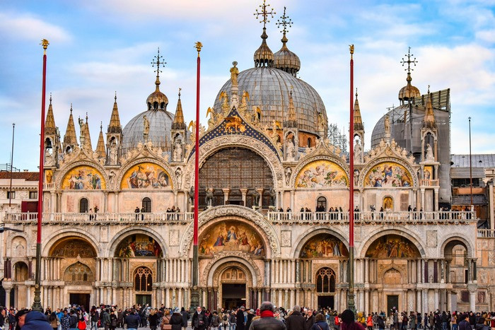 - Vương cung thánh đường San Marco – là công trình kiến trúc đẹp mê hồn nhất Venice và vẻ đẹp của nó phản ánh đức tin và sự tận tâm của người dân Venice đối với thành phố của họ. Đây là ví dụ điển hình của kiến trúc Hy Lạp – Byzantine với ảnh hưởng mạnh mẽ của Đức và Ả Rập với sàn đá cẩm thạch sang trọng, đồ khảm vàng phát sáng và các đồ lưu niệm bằng vàng trong kho bạc.